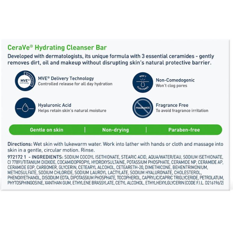 Cerave Hydrating Cleansing Bar for Normal to Dry Skin gently removes dirt, oil and makeup without disrupting skin's natural protective barrier. Ceramides help to restore the skin barrier. Uniquely formulated to thoroughly cleanse without stripping skin of its natural moisture. Helps lock in moisture 3x longer. Formula contains 5% CeraVe Moisturizing Cream to hydrate and nourish skin.