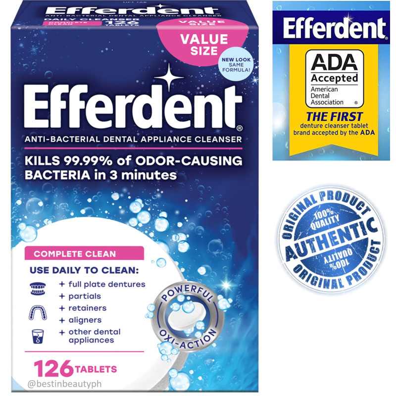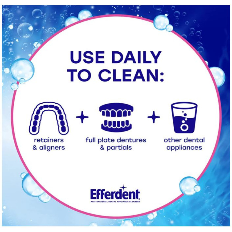 Efferdent® Complete Clean Dental Appliance Cleanser tablets fight plaque buildup and kill odor-causing bacteria. Safe to use daily, 3 minutes is all you need to give your plastic retainer or other dental appliance a complete clean.