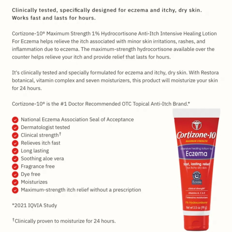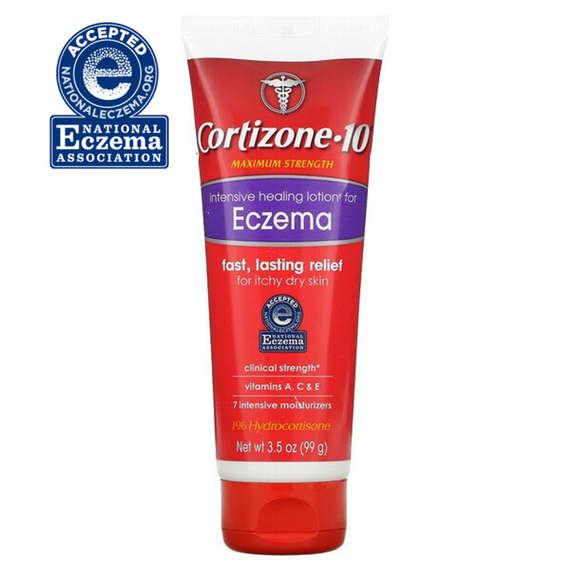 Cortizone-10® Maximum Strength 1% Hydrocortisone Itch Relief Intensive Healing Lotion for Eczema helps relieve the itch associated with minor skin irritations, rashes, and inflammation due to eczema. The maximum-strength hydrocortisone available over the counter helps relieve your itch and provide relief that lasts for hours.