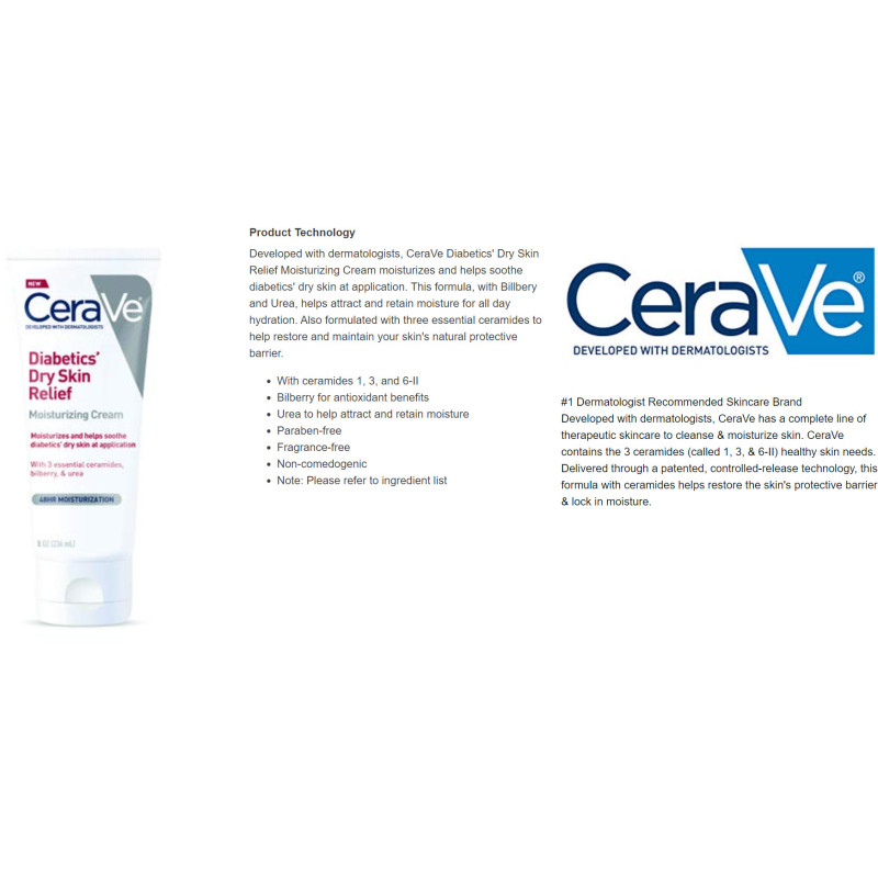 Developed with dermatologists, CeraVe offers a complete line of skincare products that contain ceramides 1, 3 and 6-11 to help restore the skin's natural protective barrier. CeraVe Diabetics' Dry Skin Relief Moisturizing Cream helps relieve dry skin at application and provides 48 hours of moisturization. The CeraVe Diabetics' Dry Skin Relief Line features products specifically formulated with bilberry and urea to help relieve diabetics' dry skin.